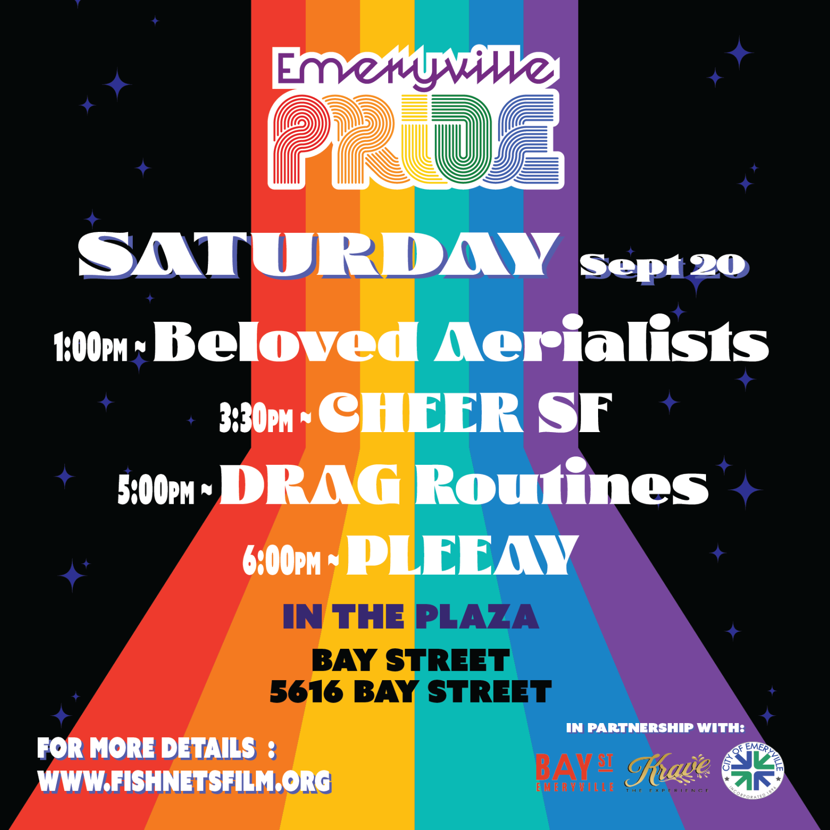 We invite you to join us for an outdoor carnival-themed festival, filled with queer joy and engagement. On The Plaza and On Bay Street, guests will engage with dozens of vendors, community partners, and sponsors, including the City of Emeryville and Emeryville Police Department. In the Plaza and at the end of Bay Street (outside Tipsy Putt), guests will find entertainment, music, and 21+ zones. The day is hosted by Emeryville PRIDE Director Robby Kendall.